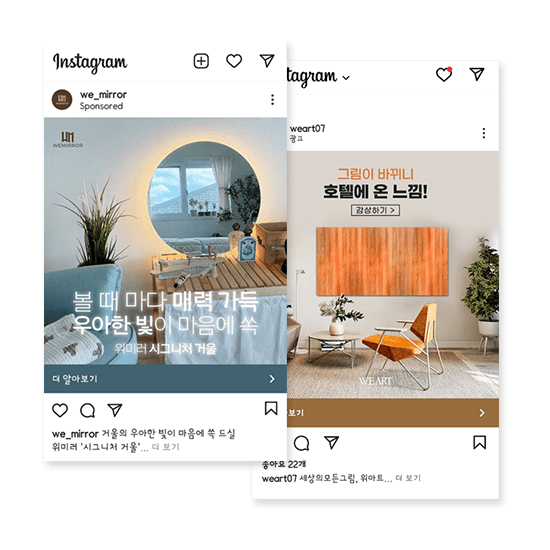 눈길을 끄는 이미지와 문구를 사용하는 깔끔하고 단순한 형식으로 고화질 이미지나 그림을 통해 상품 및 서비스를 홍보하는 광고 상품입니다. 시각적 임팩트가 강하며 다양한 플랫폼의 피드, 스토리, 서치 등에 노출됩니다.